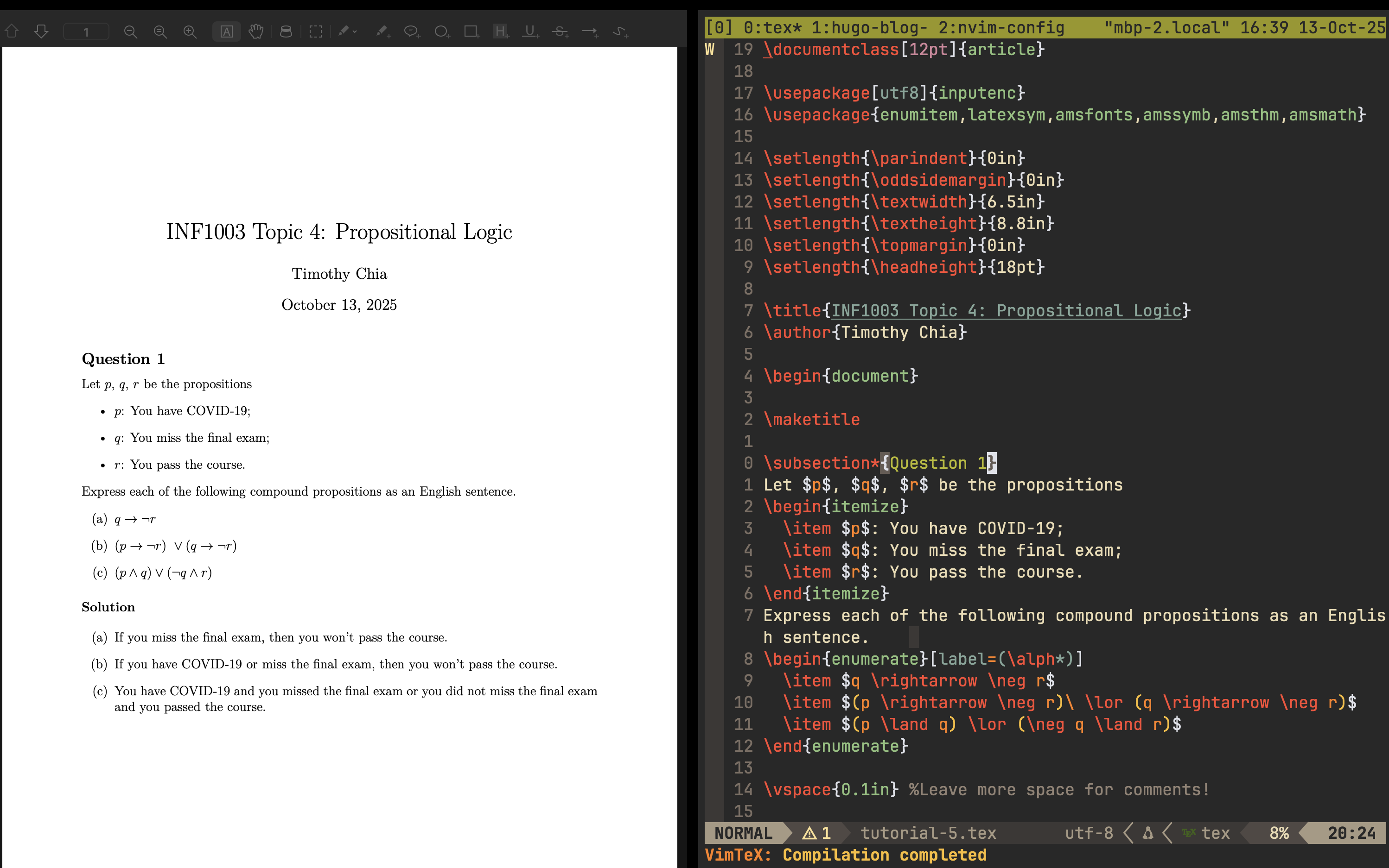 With VimTeX, Tectonic, and Skim working together, I can draft, compile, and preview polished LaTeX documents without ever leaving Neovim and that’s been a huge upgrade from handwriting notes on the iPad. This setup is fast, reproducible, and scales nicely from quick homework write-ups to longer reports.